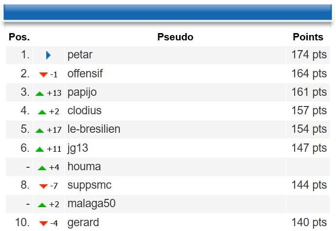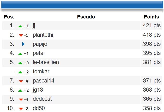 ![]() ![]() Félicitations à jj pour cette première place du classement général avec 421 pts.