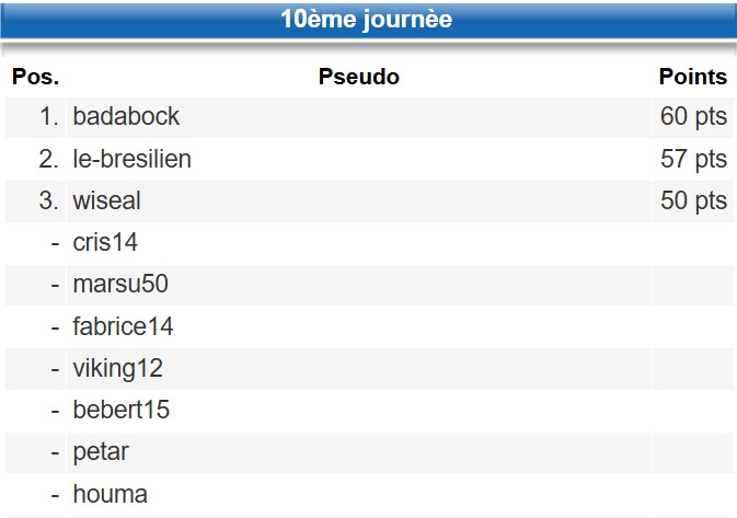 Classement des pronos à la 10 ème journée