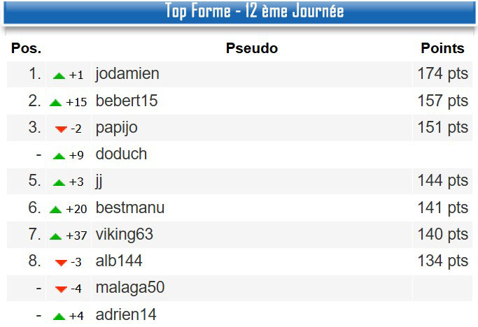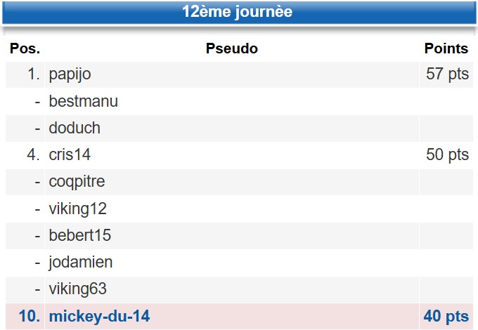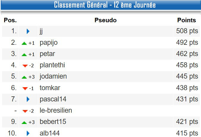 11h46 : Félicitations à papijo pour cette première place avec 57 points pour cette 12 ème journée.Félicitations à jj pour cette première place du classement général avec 508 pts.