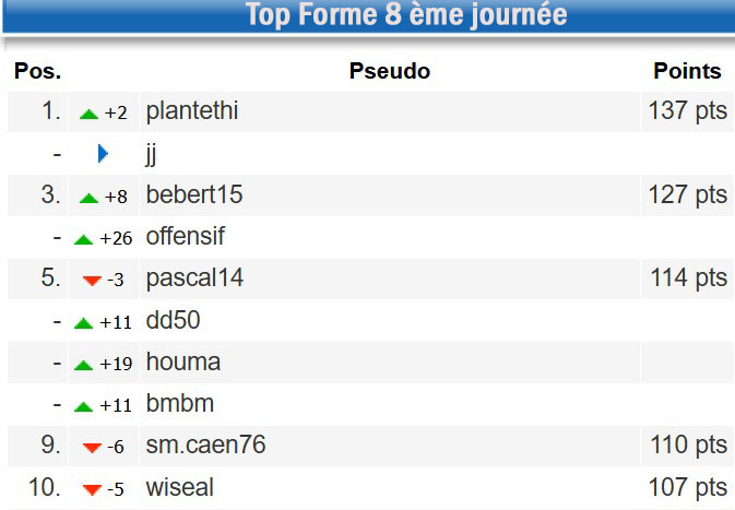 12 ème Stagnation au classement mickey-du-14 avec 244 points 39 ème Progression de 4 places au classement fabrice14 avec 234 points 47 ème Régression de 1 place au classement vincetheback avec 224 points 59 ème Progression de 3 places au classement canto14 avec 174 points Les 10 meilleurs de cette journée Le top 10 Le top forme 27 Septembre 2025