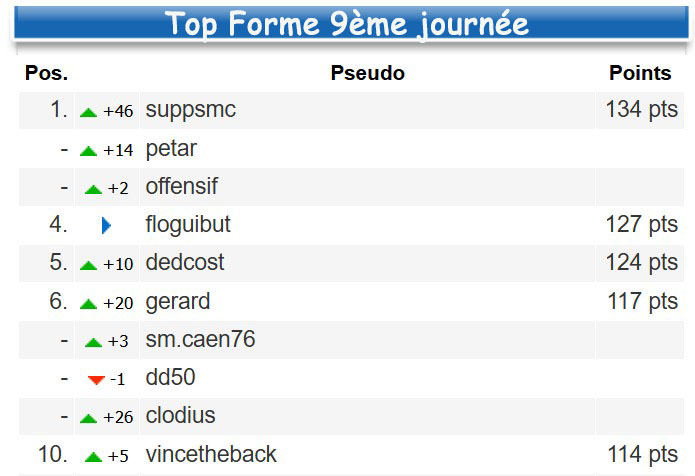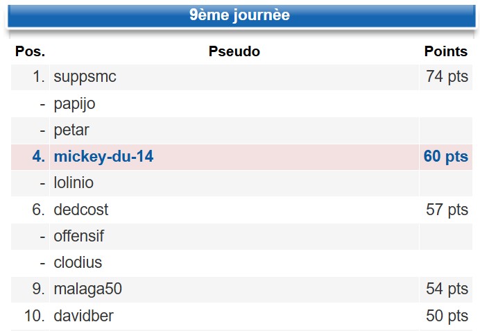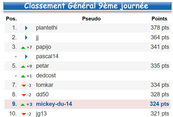 9 ème Progression de 3 places au classement mickey-du-14 avec 324 points 25 ème Progression de 10 places au classement vincetheback avec 271 points 28 ème Progression de 2 places au classement fabrice14 avec 264 points 52 ème Progression de 4 places au classement canto14 avec 211 points Les 10 meilleurs de cette journée Le top 10 Le top forme 5 Octobre 2025